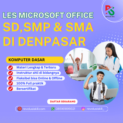 Les Microsoft Office di Denpasar – Di era digital seperti sekarang, kemampuan mengoperasikan Microsoft Office menjadi salah satu keterampilan dasar yang wajib dikuasai, baik untuk pelajar, mahasiswa, profesional, maupun pelaku bisnis. Microsoft Office, yang meliputi aplikasi seperti Word, Excel, PowerPoint adalah tools yang sangat penting untuk menyelesaikan berbagai tugas, mulai dari penulisan dokumen, analisis data, dan presentasi. Bagi Anda yang berada di Denpasar, Bali, dan ingin meningkatkan kemampuan Microsoft Office, Lembaga Revolusi Skill adalah pilihan tepat untuk mengikuti les atau pelatihan.